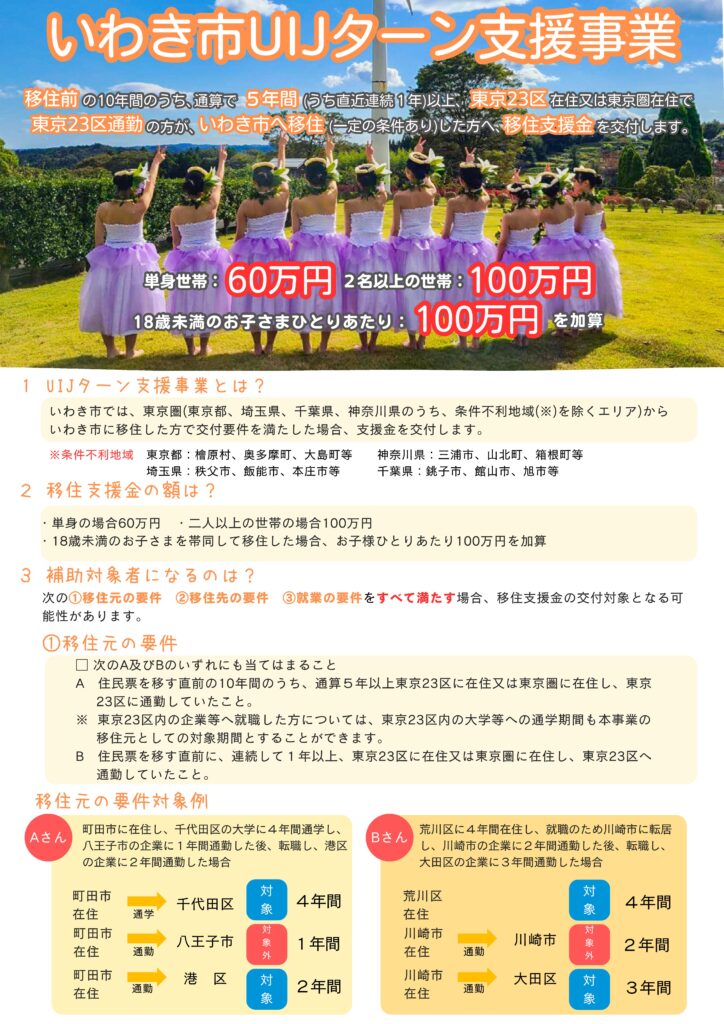 移住前の10年間のうち、通算で5年間(うち直近連続1年)以上、東京23区在住又は東京圏在住で東京23区通勤の方が、いわき市内に就職した場合などに、移住支援金を支給しています。